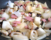 - 同じフライパンで、ピーマン以外を順に炒める。良く火が通ったら、塩コショー、ケチャップ、ピ−マンを入れて酸味を飛ばすようによく炒める、味見をする。